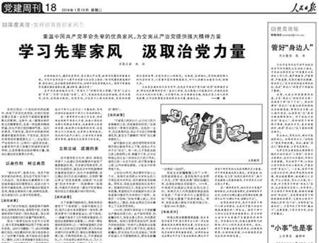 周恩来定下的“十条家规”,陈云、罗荣桓坚持不搞特殊化,张闻天从不允许子女“沾光”等革命先辈的“家风”故事,激励教育着一代又一代人。在近一个世纪的风雨征程中,中国共产党积淀了许多优良传统。《人民日报》的党建周刊自2016年1月19日起,推出“深度关注·怎样培育良好家风”专题报道,重温中国共产党革命先辈的优良家风,以期为全面从严治党提供强大精神力量。