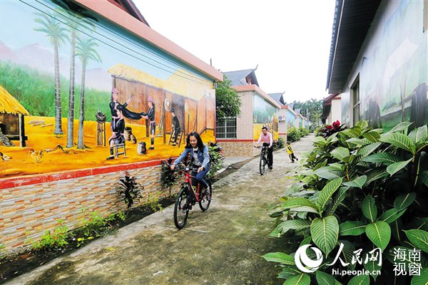 琼海会山加脑村 游客在苗绣园村骑行