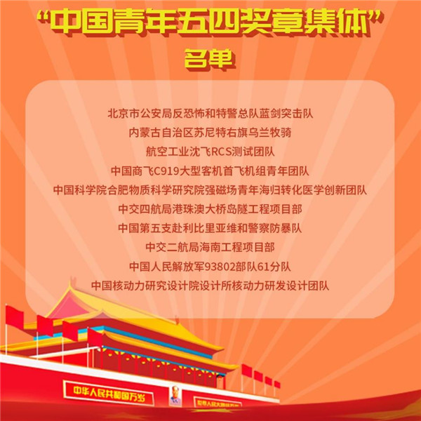 荣获第22届“中国青年五四奖章集体”的分别是:北京市公安局反恐怖和特警总队蓝剑突击队,内蒙古自治区苏尼特右旗乌兰牧骑,航空工业沈飞RCS测试团队,中国商飞C919大型客机首飞机组青年团队,中国科学院合肥物质科学研究院强磁场青年海归转化医学创新团队,中交四航局港珠澳大桥岛隧工程项目部,中国第五支赴利比里亚维和警察防暴队,中交二航局海南工程项目部,中国核动力研究设计院设计所核动力研发设计团队,中国人民解放军93802部队61分队。
