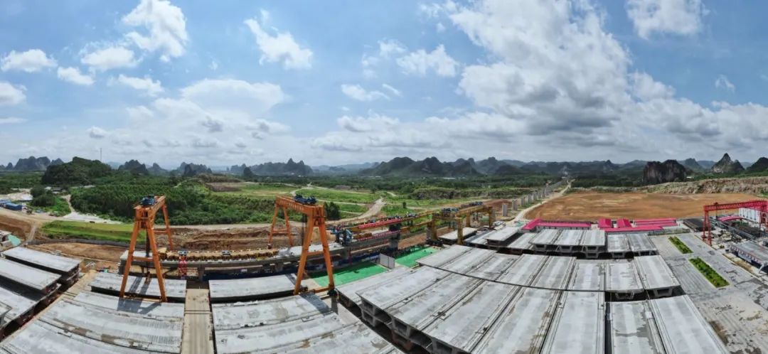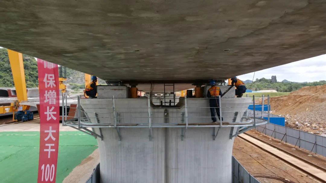 6月2日11时,在贵南高铁广西段伊岭岩双线特大桥箱梁架设现场,一榀长32.6米、重900吨的简支箱梁被吊装到指定桥墩的预接孔内,标志着贵南高铁广西段南宁片区首榀箱梁成功架设。至此,贵南高铁广西段桥梁工程整体进度过半,贵南高铁离全线通车再进一步。