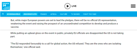 尽管欧盟官员在公开场合乐观评价这一活动,但私下里他们对美国的缺席感到失望。“欧盟积极回应了全球行动的呼吁,但美国拒绝了。他们是在孤立自己,”一名官员表示。——France 24电视台援引法新社5月4日报道