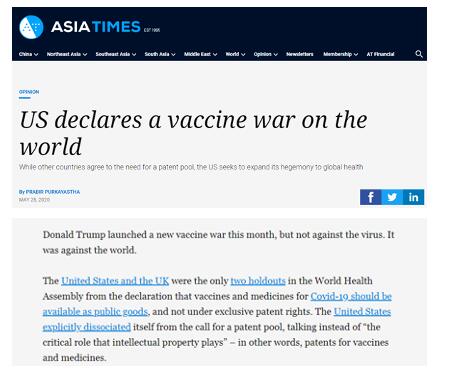 世界卫生大会倡议,将治疗新冠肺炎的疫苗和药物作为公共产品,而不享有独有专利,美国和英国是唯二反对这一提议的国家。美国明确反对建立专利池的呼吁,大谈特谈“知识产权发挥的关键作用”,即疫苗和药物的专利。