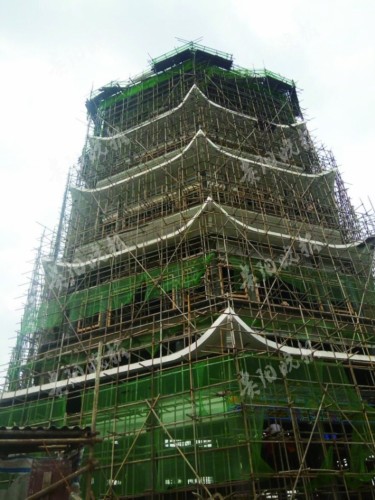 戴上安全帽,记者沿着架在山体上的用竹排铺设的便道来到塔前,灰色的钢筋水泥塔身十分巍峨高大,高约五六十米,共5层。沿着塔基,记者环塔一周,发现往蟠桃宫方向,还有亭廊相连,亭廊已经封顶,几位工人在亭廊顶上工作。在塔上,几位画工正站在外墙上,为塔描彩绘。