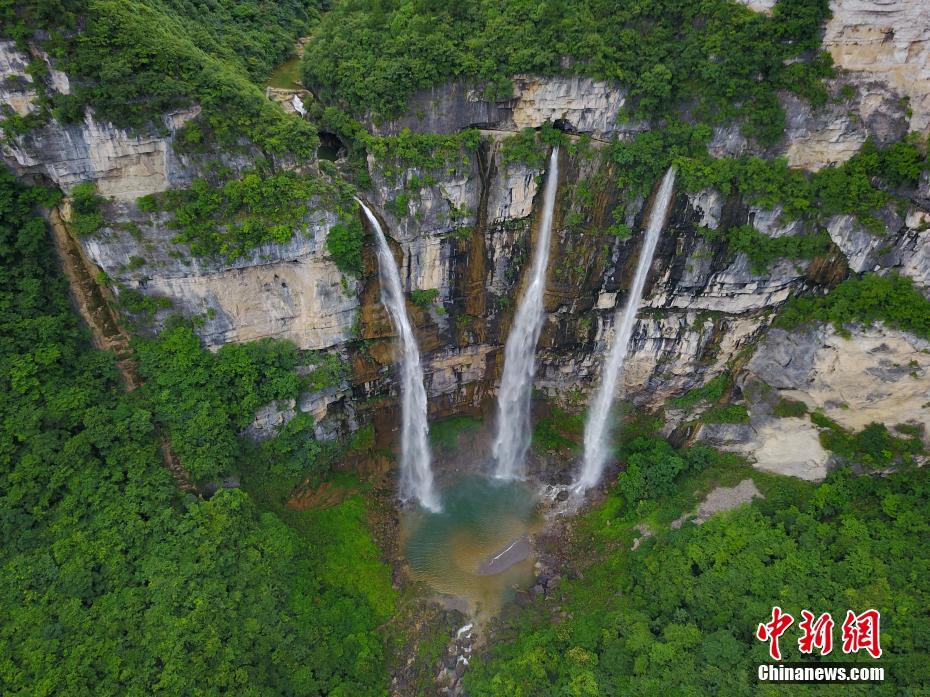 7月7日,航拍贵州施秉县飞水岩“三瀑共挂”景观。飞水岩瀑布位于贵州省施秉县甘溪乡,落差148米,三条瀑布共宽85米,进入雨季,飞水岩瀑布三瀑同挂的场面壮观,吸引不少游客前来观光游玩。