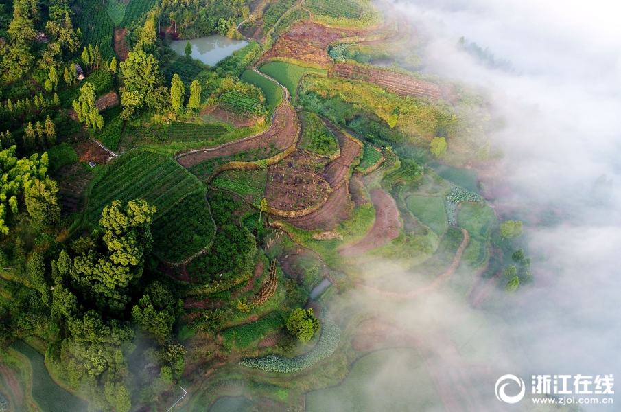 8月19日,鸟瞰云海缭绕的仙居方岩。仙居方岩,为括苍余脉,属火山流纹岩地貌,它平地崛起,方正如城,四面峭壁,高不可攀,常年云雾缭绕,把整个方岩托在半空,仿佛海市蜃楼般的神秘而悠远。(浙江在线拍友 王华斌 摄)