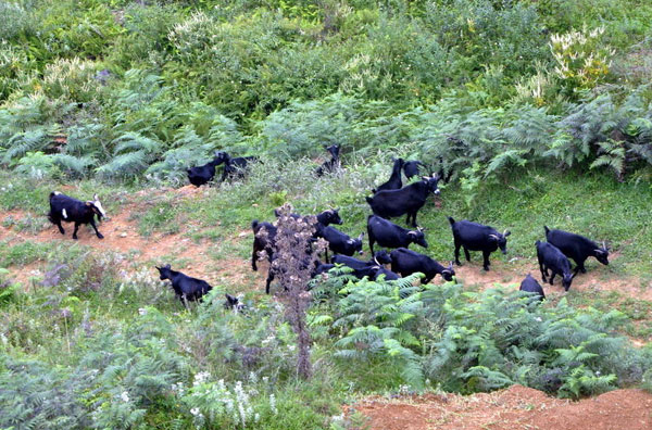平稳的缆车拾阶而上时,早起的阴天早已不在了,云开了雾散了。脚下是翠绿的青草和矮棵树木,有成片成片的泛灰白色的熔岩石,点缀在草木之间,好似成群的山羊在山坡上觅食吃草。其实,山坡上,确实有苗族和彝族老乡放牧的羊群,但不是白色的,都是当地特有的闻名全国的黑山羊珍品,叫马头羊。黑色的羊群在山坡上自由自在的吃草,各个膘肥体壮,黝黑瓦亮的。贵州名优特产的赫章黑山羊的价格也比普通的黑山羊价格高上一倍。