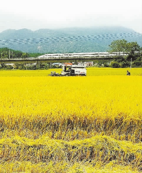 10月6日,汨罗市弼时镇毛家坊村武广高铁沿线,稻田一片金黄,村民用收割机收割稻子。他们说,国庆、中秋长假里他们忙着秋收,现在用收割机,一大片田很快就收割完了。彭展 摄