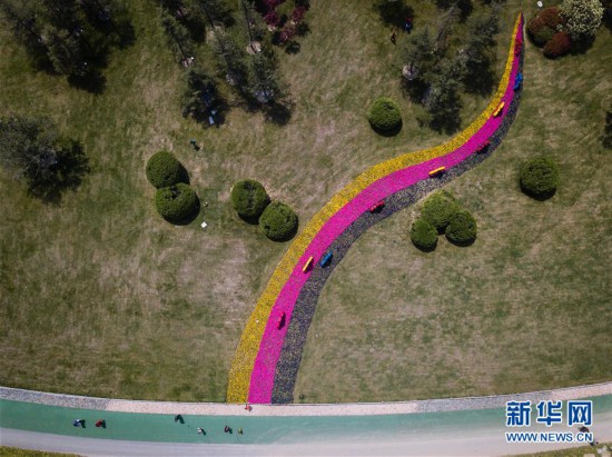 4月15日,在扬州市运河三湾风景区,游人在健身步道上散步(无人机拍摄)。