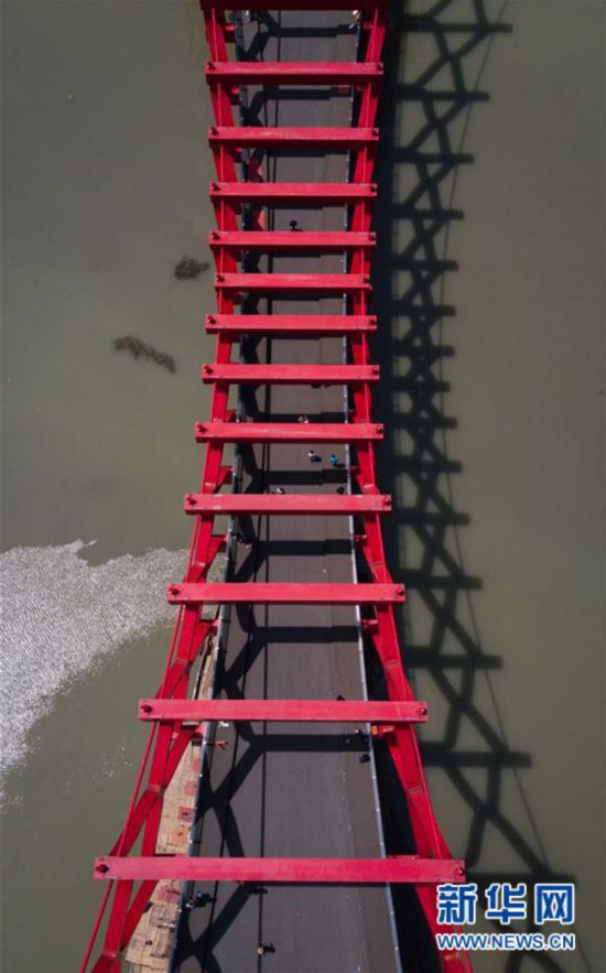 4月15日,在扬州市运河三湾风景区,游人走过剪影桥(无人机拍摄)。
