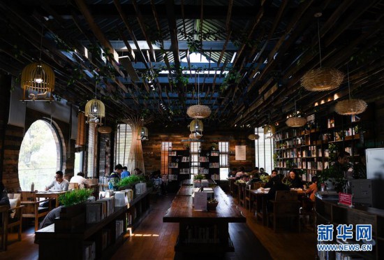 4月15日,在扬州市运河三湾风景区,游人在城市书屋内阅读。