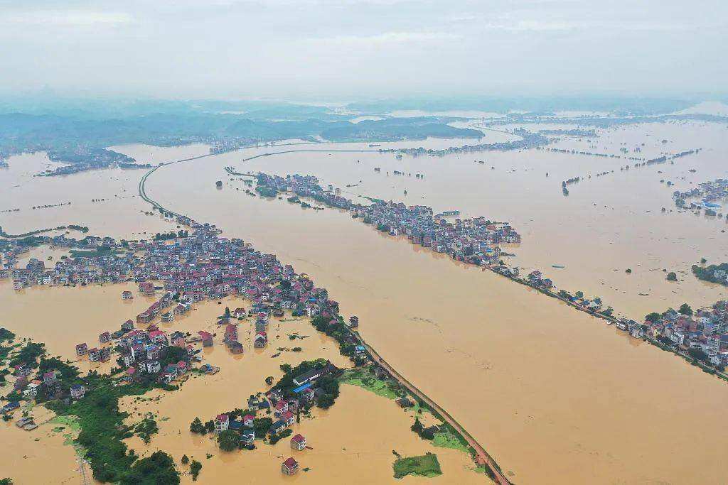 工人日报记者航拍鄱阳洪灾现场:整个村庄被泡在水里,村民乘船出行