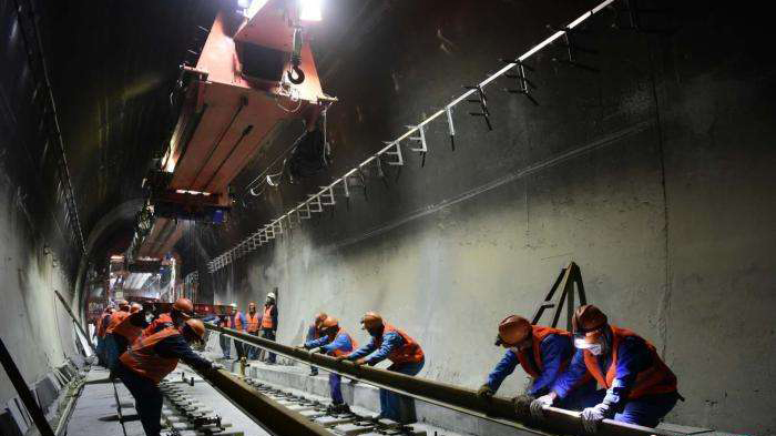 工人日报客户端5月31日电 5月29日下午,随着两根500米长钢轨成功铺设,格库铁路全线第一长隧阿尔金山隧道完成铺轨任务。