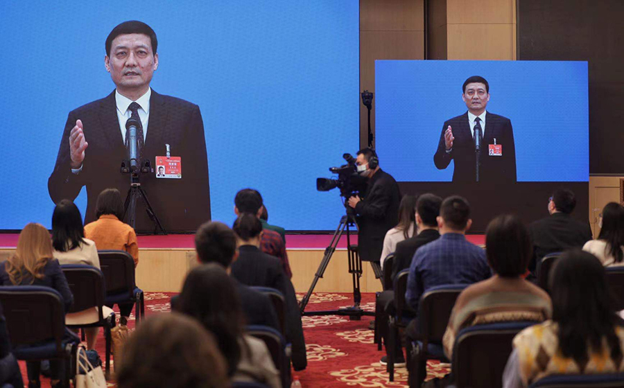 工信部部长肖亚庆回答记者提问。工人日报记者 杨登峰 摄