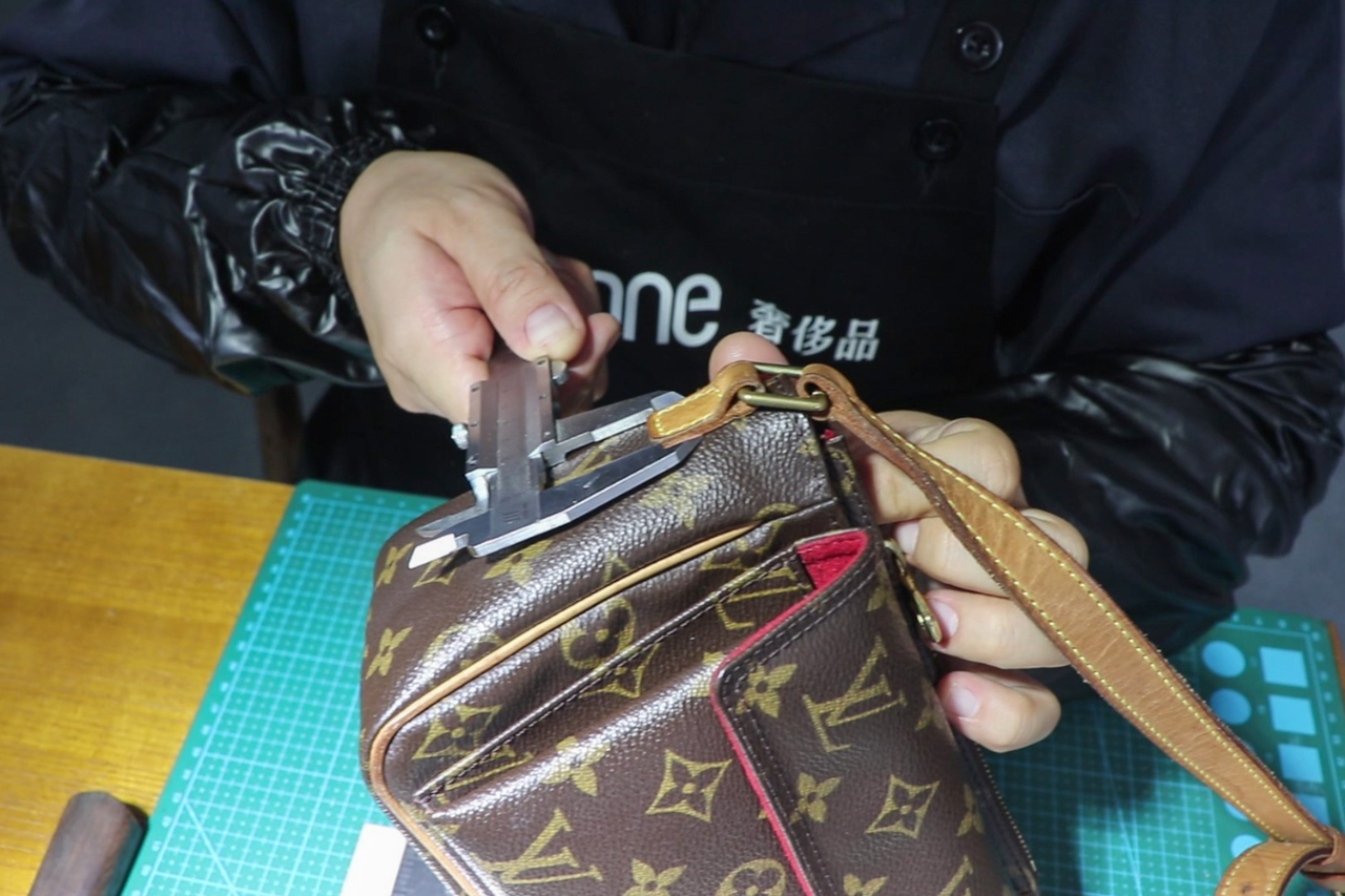 工作台前,王雷用卡尺仔细测量背带的宽度。由于卡口长期磨损,背带的皮革已经脱落,他要重新更换背带的卡口部位。切割、上色、打孔、缝合……王雷拿出“十八般兵器”在约3厘米宽的皮革上精雕细琢,力求还原背带最初的样子。
