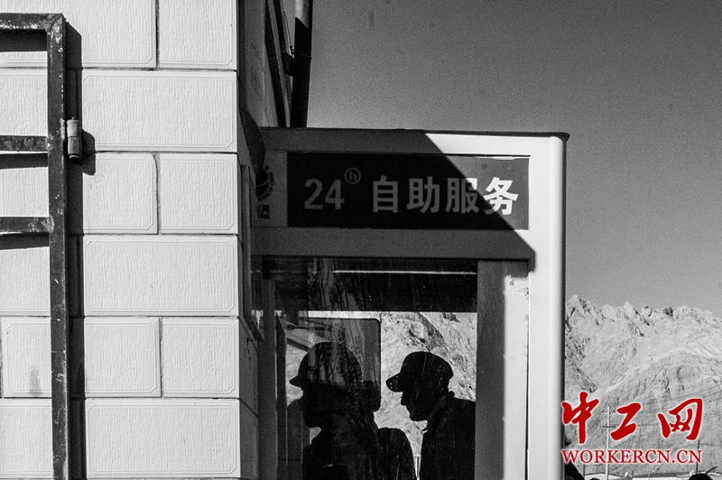 供电所安了穿墙式自助交费终端,收费员凯比努尔帮助不会使用自动交费机的柯尔克孜族大叔。