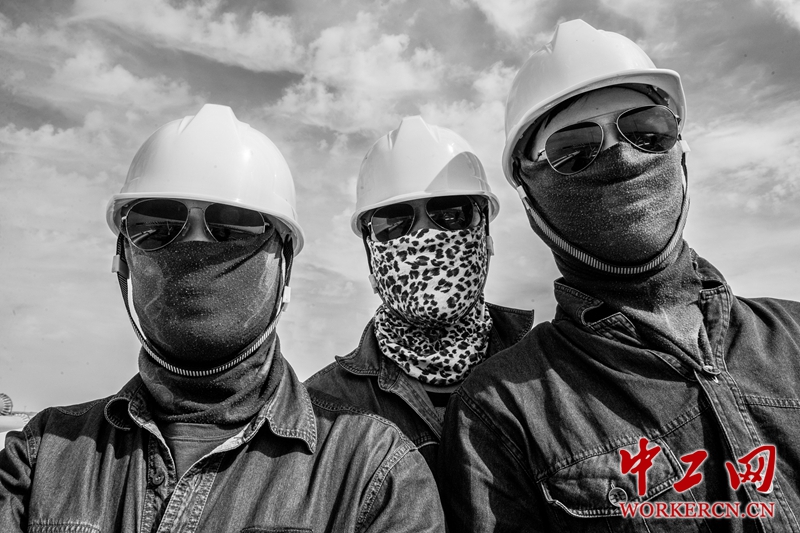 三位来自安徽送电工程公司的青年职工全副“武装”的工地肖像照。他们今年春天来到工地,至今没有回过家。