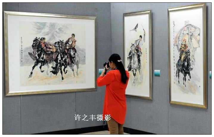 2013年10月5日,由中国画马艺术研究会主办的“奋骐骥壮慨 写时代风云——中国当代画马名家迎马年精品画展(北京展)在中国人民革命军事博物馆开幕。此次展览是中国画马艺术研究会成立以来的首次展览。画展由中国美术家协会主席刘大为先生亲自题写了“奋骐骥壮慨,写时代风云”,参展艺术家除了30余位当代画马名家作品外,还有已故的画马大家徐悲鸿先生、尹瘦石先生、溥佐先生的画马力作,也有仍活跃于当今画马领域的领军人物韦江凡、许勇、易宏斌等风格鲜明的马画精品。同时并出版了由中国画马艺术研究会编委会主编的大型画册《奋骐骥壮慨 写时代风云——中国当代画马名家迎马年精品集》。图为精品邀请展开幕式现场。工人日报-中工网记者许之丰摄影报道