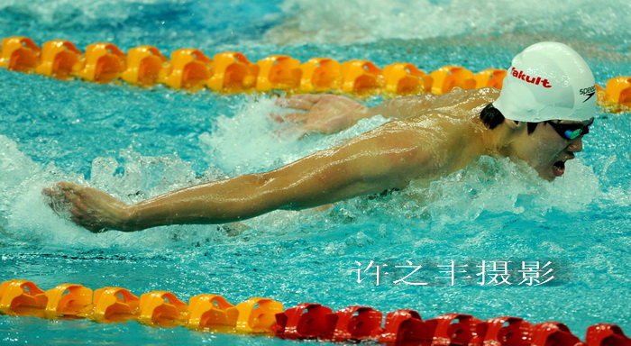 2013年11月14日国际泳联短池游泳世界杯系列赛北京站在上水立方国家游泳中心闭幕,中国选手一共获得1枚金牌5枚银牌,2枚铜牌。邵依雯获得女子400米自由泳金牌;汪顺夺得男子200米个人混合银牌。另外中国选手傅园慧夺得女子50米仰泳银牌,汪顺夺得男子200米蝶泳银牌,中国队还夺得男女4X50米混合泳接力银牌。毛飞廉夺得男子200米蛙泳铜牌。图为中国名将汪顺在男子200米蝶泳比赛中。工人日报-中工网记者许之丰摄影报道