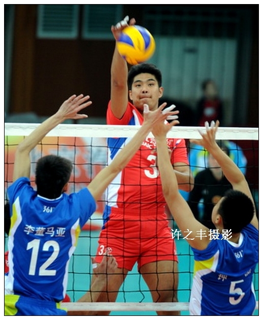 2013年12月1日晚,2013-2014赛季男子排球联赛第一轮比赛在北京光彩体育中心进行,上赛季男子排球联赛和全运会双料冠军北京汽车男排以3比0轻松战胜河北。图为北京队胡希召和新外援沃特的网上扣球。工人日报-中工网记者许之丰摄影报道