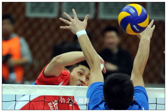2013年12月1日晚,2013-2014赛季男子排球联赛第一轮比赛在北京光彩体育中心进行,上赛季男子排球联赛和全运会双料冠军北京汽车男排以3比0轻松战胜河北。图为北京队胡希召和新外援沃特的网上扣球。工人日报-中工网记者许之丰摄影报道
