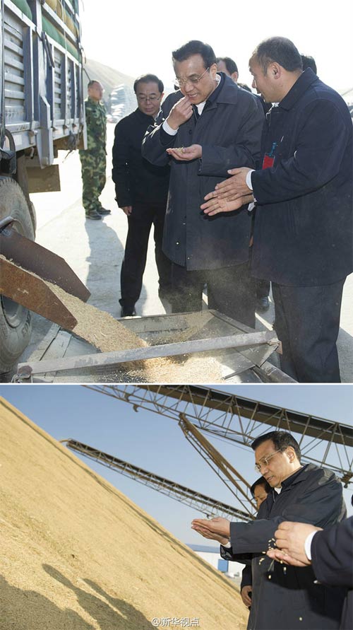 新华网北京11月4日电 据新华社“新华视点”微博报道,黑龙江抚远浓桥粮库烘干塔前,传送带正在输送金黄的稻谷。李克强抓起一把稻粒仔细查看,并捡出一粒咀嚼,体会测算水分。看到新收的稻米堆积成山,李克强对工作人员说,人是铁,饭是钢,大米是金。这谷堆是真正的“金山”,你们是在“金山”上工作,责任重大。
