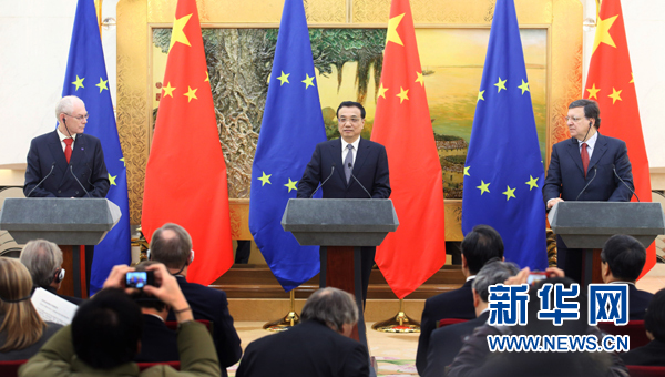 李克强与欧洲理事会主席范龙佩、欧盟委员会主席巴罗佐共同会见记者