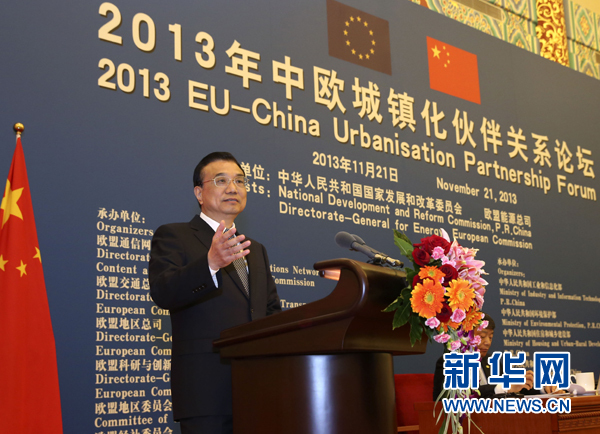11月21日,中国国务院总理李克强在北京人民大会堂与欧洲理事会主席范龙佩、欧盟委员会主席巴罗佐共同出席中欧城镇化伙伴关系论坛闭幕式并致辞。这是李克强在致辞。新华社记者 庞兴雷 摄