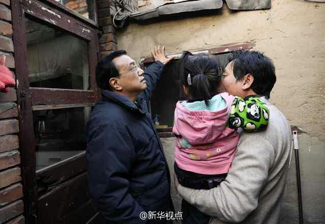 新华社北京12月27日电 据新华社“新华视点”微博报道,沿着仅能通过一人的狭窄巷道,李克强弓着身子穿过一道小木门,才走进了天津西于庄棚户区居民李忠义的家里。19平米的房间,一张高低床就占了大半面积。在呛人的炉烟味中,李克强弯腰坐在床铺上,对77岁的李忠义说,政府一定让你住上有暖气、有厨房、有厕所的新房!