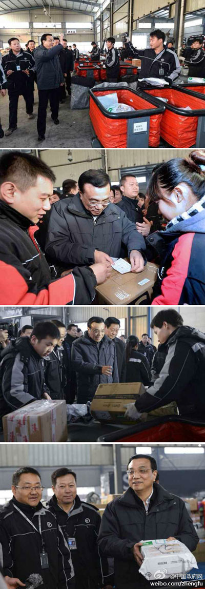 新华网北京1月27日电 据中国政府网官方微博报道,27日,李克强到西安顺丰速运有限公司看望慰问快递工人。李克强说,快递业关系经济民生,你们既是在运送商品,也是在传递亲友心意,给大家送去春节的温暖,把幸福快递到千家万户。快递业是中国经济的“黑马”,祝你们在马年快马加鞭、万马奔腾、马到成功!