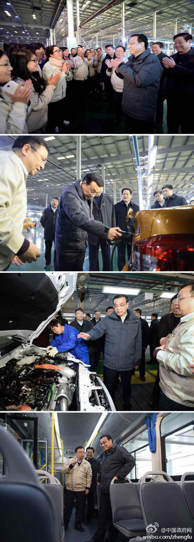 新华网北京1月27日电 据中国政府网官方微博报道,27日,李克强到西安比亚迪汽车有限公司了解纯电动汽车研发。李克强说,你们的工作非常有益,新能源汽车,特别是公交车能改善城市污染和噪音问题,要倡导人人使用,政府要起到示范作用。他说,面对不断加剧的环境污染,我们要直面问题,向污染宣战!
