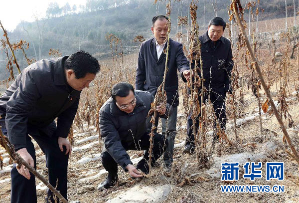 2014年1月27日,李克强在旬阳县金坡村攀上陡坡,扒开土块查看旱情。新华社记者 丁林 摄