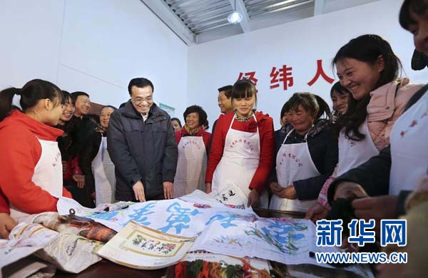 2014年1月26日,在云盖寺镇花园小区美云秦绣公司,李克强与接受刺绣培训的搬迁居民亲切交谈。新华社记者 丁林 摄
