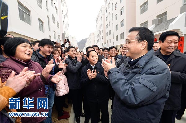 2014年这是1月26日,李克强在云盖寺镇花园小区看望搬迁居民,希望他们在新的家乡,把日子过得万马奔腾。新华社记者 李涛 摄