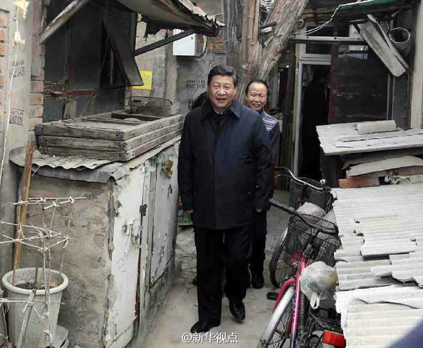 玉河旁的雨儿胡同东起南锣鼓巷,西至东不压桥胡同,是老北京的大杂院区。习近平沿着弯曲狭窄的通道,先后走进29号、30号大杂院,到王云凤、关世岳、吴爱霞、庄宝等4户居民家里察看,嘘寒问暖,关切询问他们工作怎么样、收入有多少、做饭烧什么、取暖怎么办、上厕所远不远?得知他们的居住、生活条件在党和政府关心下有所改善,特别是做饭用上了煤气、取暖用上了电暖气,并且有关部门已经将这片大杂院区纳入了改造规划,习近平很高兴。他表示,这一片胡同我很熟悉,今天来就是想看看老街坊,听听大家对老城区改造的想法。老城区改造要回应不同愿望和要求,工作量很大,有关部门要把工作做深做细,大家要多理解多支持,共同帮助政府把为群众办的实事办好。听说总书记来了,居民们纷纷围上来向总书记问好,习近平走上去同他们热情握手,祝他们生活越来越好。