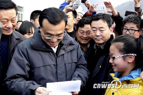 1月26日,李克强到陕西省商洛市镇安县云盖寺镇移民安置社区看望群众。初一小女孩江欣桐挤到总理面前说:“李爷爷,我给您写了一封信,还有一枝花。”总理接过花,拆开信说:“谢谢你,我回去后给你回信。”