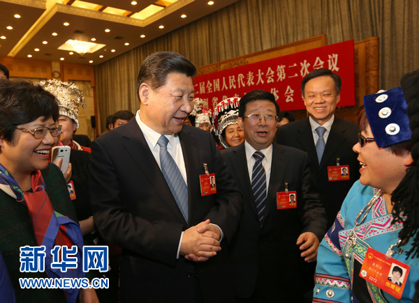 3月7日,中共中央总书记、国家主席、中央军委主席习近平参加十二届全国人大二次会议贵州代表团的审议。这是习近平来到女代表中间,同她们亲切交流,并表示,明天就是国际劳动妇女节,借此机会,代表党中央、国务院,向女代表、女委员及全国各界妇女同胞,致以节日的问候。新华社记者刘卫兵摄