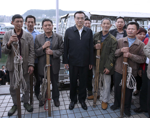 万州港是水陆交通重要枢纽。李克强与正在这里等着帮旅客挑运货物的农民们亲切交谈,叮嘱他们干活时注意身体。李克强说,你们很了不起,负重前行,爬坡越坎,每一分收入都是出力流汗挣来的,也方便了千万人,中国人民的勤劳智慧铸就了中国发展的潜力和韧性。