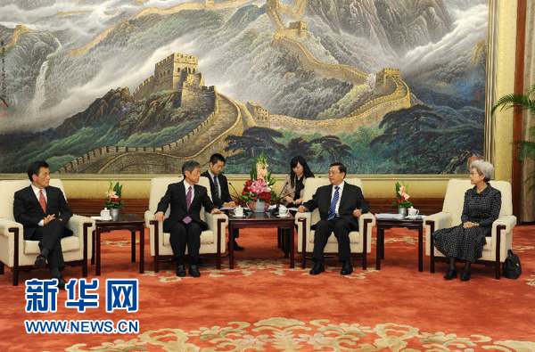 5月5日,中国全国人大常委会委员长张德江在北京人民大会堂会见以高村正彦会长为团长的日本日中友好议员联盟代表团。 新华社记者饶爱民摄
