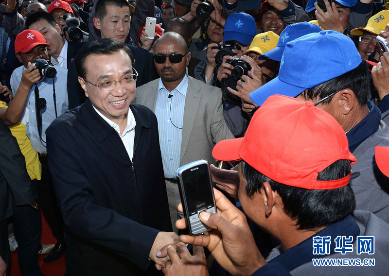 5月5日,中国国务院总理李克强与埃塞俄比亚总理海尔马里亚姆共同出席亚的斯亚贝巴-阿达玛高速公路一期竣工揭牌典礼,并为二期工程开工奠基剪彩。这是典礼结束后,李克强同工程施工人员亲切交谈。新华社记者 李涛 摄