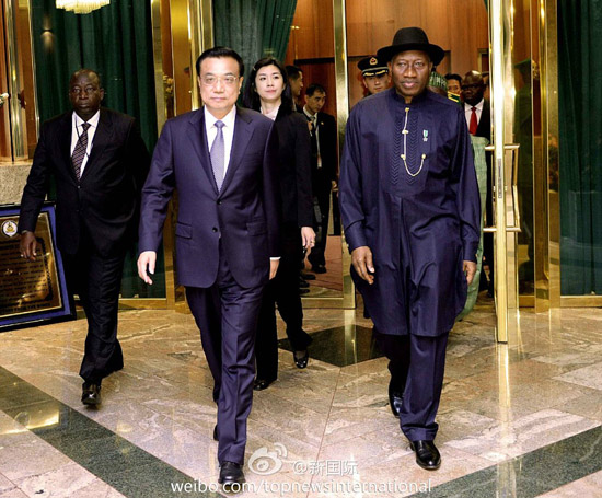 新华社北京5月8日电 据新华社“新国际”微博报道,李克强7日与尼日利亚总统乔纳森会谈。乔纳森感谢李克强在尼安全形势严峻的情况下如期到访,是患难见真情。李克强表示中方将对尼提供各种支持和帮助,同时希望尼方切实加强对在尼中国公民的保护。目前中国在尼有6.5万人,是我在非人员最多的国家之一。