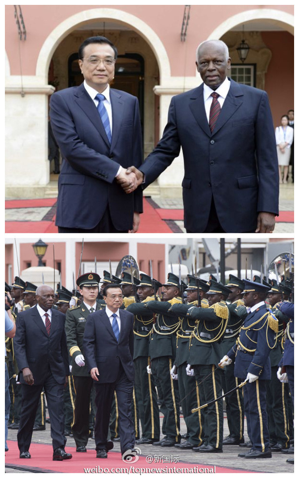 新华网北京5月9日电 据新华社“新国际”微博报道,5月9日,国务院总理李克强在罗安达总统府出席安哥拉总统多斯桑托斯举行的欢迎仪式。李克强总理在多斯桑托斯总统陪同下检阅了仪仗队。