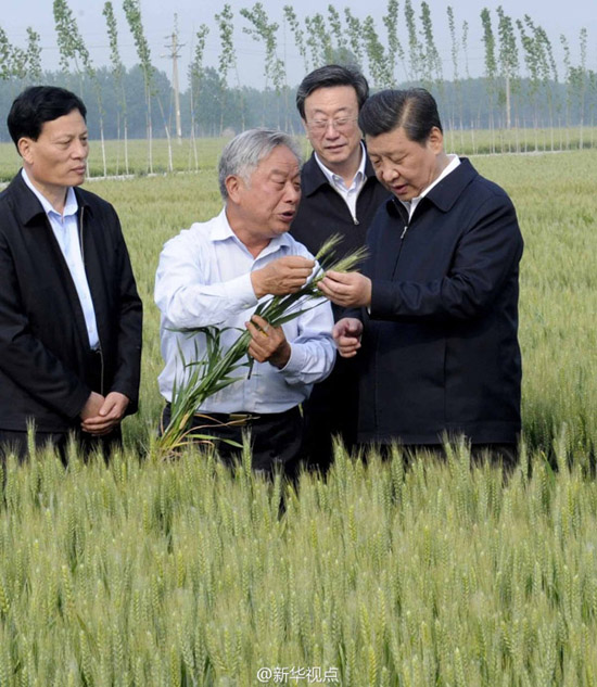 新华社北京5月9日电 据新华社“新华视点”微博报道,微风吹拂,麦浪滚滚。习近平总书记9日下午来到河南省尉氏县张市镇,走进一片高标准粮田,看麦穗灌浆,问农田建设。看到清一色的小麦长势喜人,他说:“我们都是种庄稼出身,小麦长势这么好,我和你们一样欣慰。用老乡的话说,今年的馍能吃上了。”