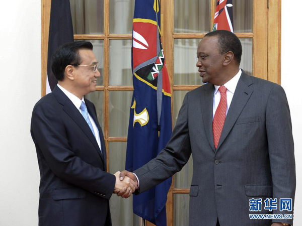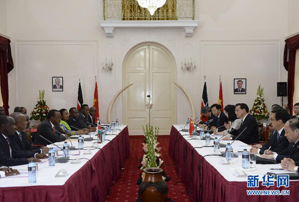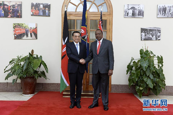 肯雅塔代表肯尼亚政府和人民热烈欢迎李克强访肯,表示在周恩来总理访非50周年之际,李克强总理对非洲进行的里程碑式访问取得圆满成功,将进一步深化非中新型战略伙伴关系。肯中有着相同的历史遭遇和发展任务,肯方感谢中方对肯经济社会发展和保护生态环境、野生动物资源的帮助和支持,高度赞赏中国为维护非洲和平与发展作出的重要贡献,完全赞同李克强总理在非盟演讲中提出的“461”非中合作框架和在世界经济论坛非洲峰会特别致辞中提出的合作建设非洲基础设施“三大网络”的主张,愿与中方加强战略沟通,全面推进各领域合作,实现共同发展。肯方愿做中国企业进入非洲的门户,为推动非中合作发挥积极作用。