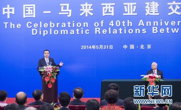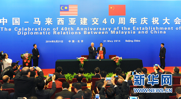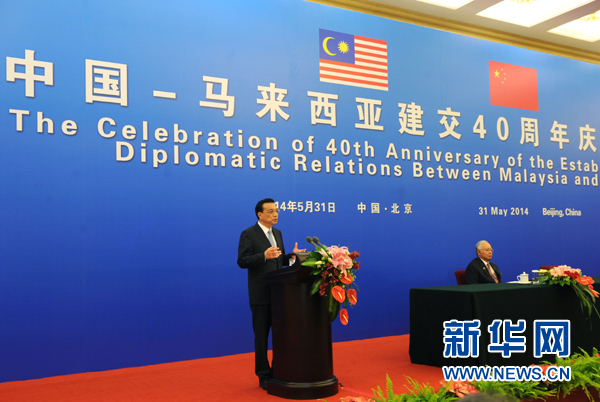 新华社北京5月31日电(记者谭晶晶)中国与马来西亚建立外交关系40周年庆祝大会31日在人民大会堂举行。国务院总理李克强和马来西亚总理纳吉布共同出席并发表讲话。