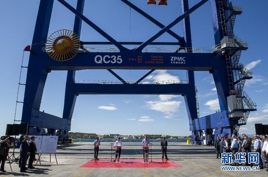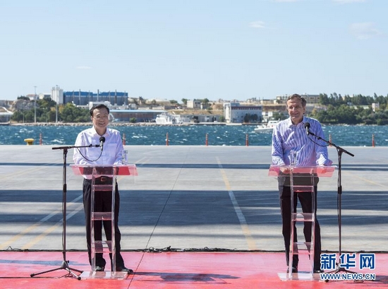 6月20日,国务院总理李克强与希腊总理萨马拉斯共同考察中国远洋运输集团比雷埃夫斯集装箱码头。这是李克强和萨马拉斯在3号码头发表讲话。新华社记者 王晔 摄
