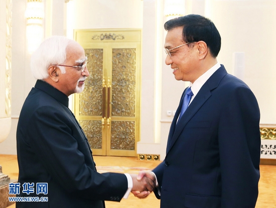 6月28日,国务院总理李克强在北京人民大会堂会见印度副总统安萨里。新华社记者 姚大伟 摄