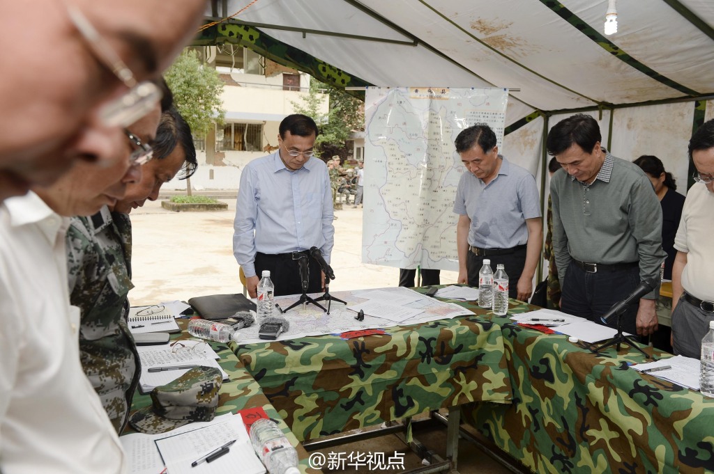 新华社北京8月4日电 据新华社“新华视点”微博报道,4日下午,李克强在云南鲁甸地震震中龙头山镇察看灾情,指挥抗震救灾,并在现场主持召开协调会,解决救灾中遇到的问题。会前他提议全体起立,为此次地震中的遇难者默哀。