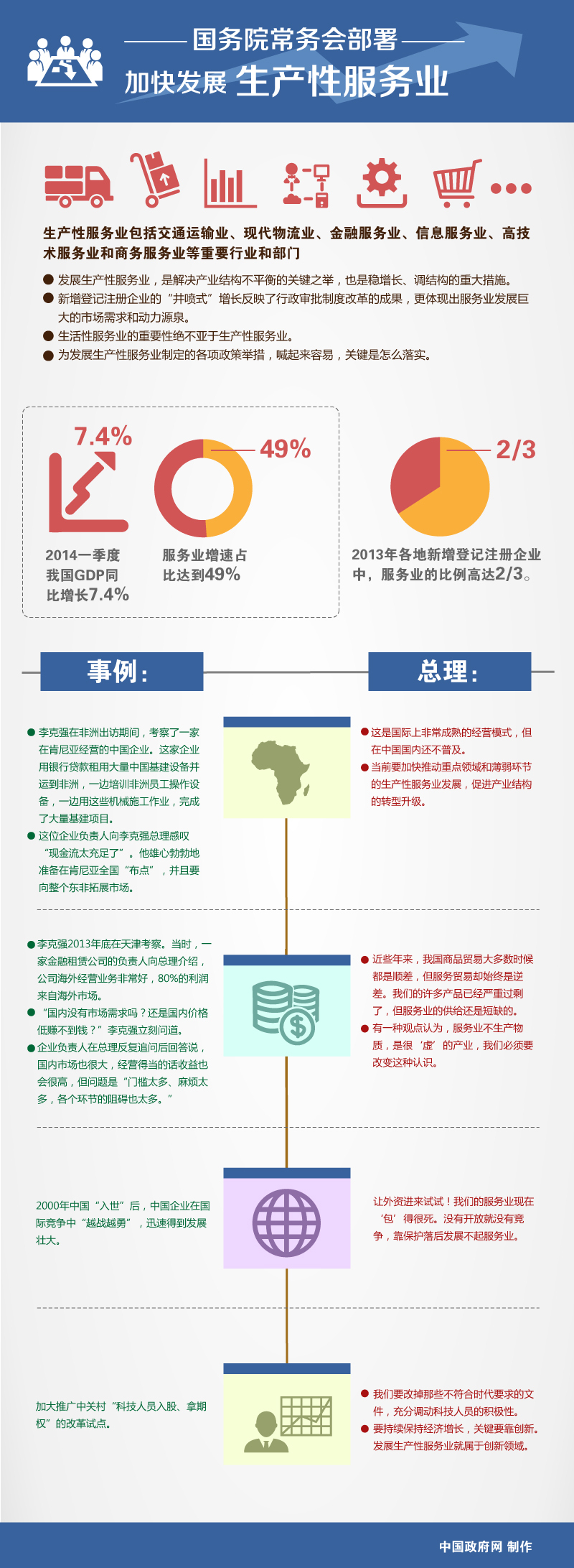 3月5日,李克强在《政府工作报告》中提出,优先发展生产性服务业,推进服务业综合改革试点和示范建设;3月21日,李克强在节能减排及应对气候变化工作会议上提出要“着力发展服务业,特别是生产性服务业”;4月10日,李克强在博鳌亚洲论坛2014年年会开幕式上的演讲中再次强调,加快弥补服务业这块“短板”,用税收等杠杆来培育壮大生产性和生活性服务业。