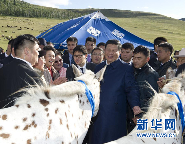 8月22日,国家主席习近平在蒙古国总统额勒贝格道尔吉陪同下前往乌兰巴托市郊观看那达慕。额勒贝格道尔吉向习近平夫妇赠送两匹蒙古马。习近平为两匹马分别取名阿尔泰和克鲁伦,寓意中蒙两国山水相连、睦邻友好。新华社记者 黄敬文 摄