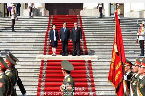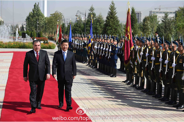 新华社北京9月13日电 据新华社“新国际”微博报道,9月13日,习近平主席在杜尚别同塔吉克斯坦总统拉赫蒙会谈,两国元首就深化中塔关系达成重要共识。会谈前,拉赫蒙在民族宫前广场为习近平举行隆重的欢迎仪式。习近平和夫人彭丽媛抵达时,受到拉赫蒙热情迎接。习近平在拉赫蒙陪同下检阅仪仗队。(马占成)